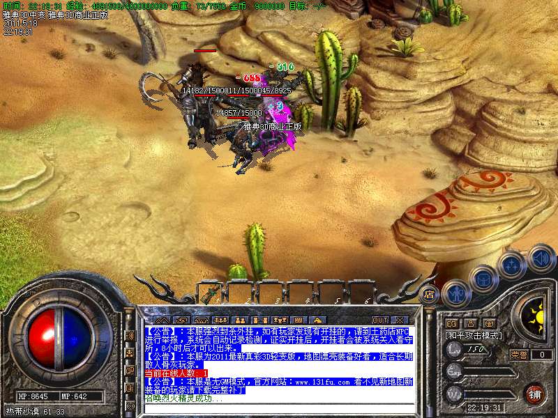 【特色9】;散人淘宝地图是个很不错的地方,怪物好打,偶尔可以爆出:残阳,凌云,甚至是雅典装备。