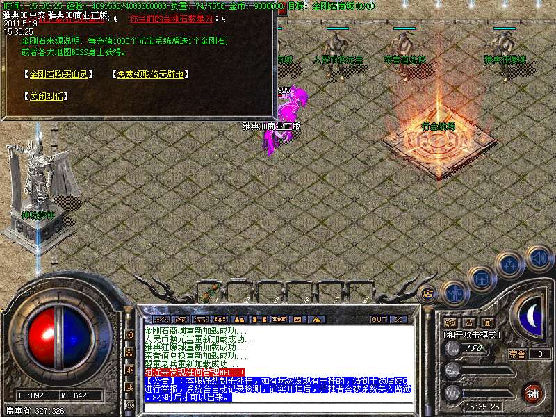 【特色14】;增加了会员服务一键回收的功能,让你打怪赚元宝更回轻松。增加了金刚石打BOSS可获得。