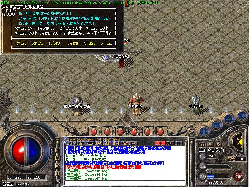 【特色14】游戏中所有BOSS均有几率掉RMB。RMB分为1角,5角,1元,2元,3元,5元。获得后可以去土城财神爷处。换取相应的元宝。