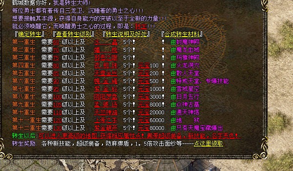 【更新】更新转生系统,1-12转,转生后每转都可以获得相应属性点,另外还设置转生奖励,4-12转可以分别领取各种技能书及超级装备,防麻痹盾牌,1。5倍力量面纱等!!具体土城转生炉处了解!