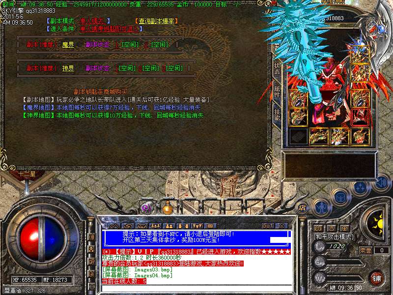 【魔界】进入此副本,刷很多BOSS,可暴本服任何装备。通关后可获得经验奖励或者直接进入混沌之地。