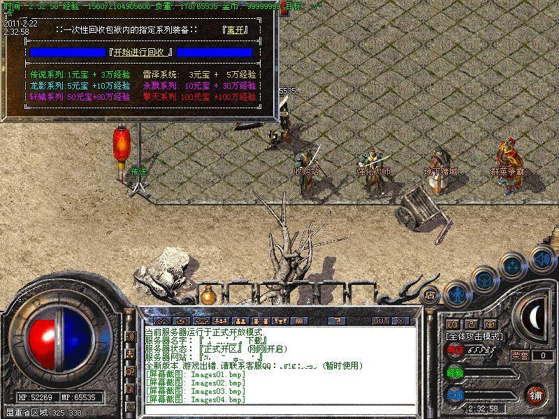 系统公告:从圣战到战神装备都可以在土城[回收装备]处进行回收处理,可以一键批量回收和单件回收,无法批量回收的请单件回收