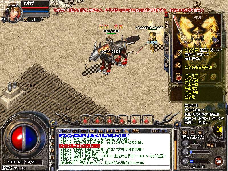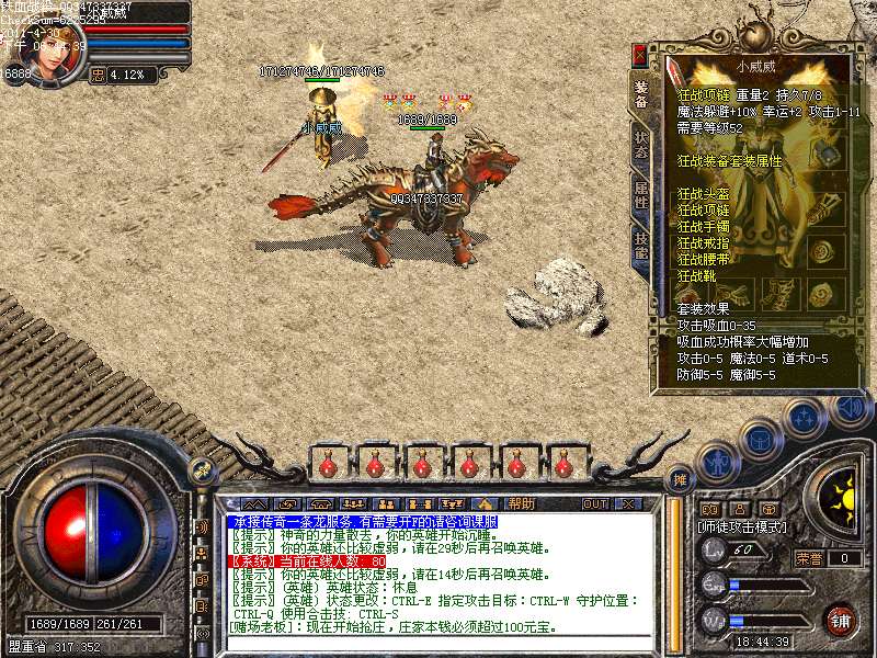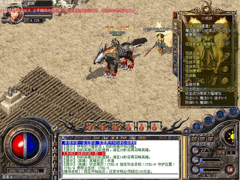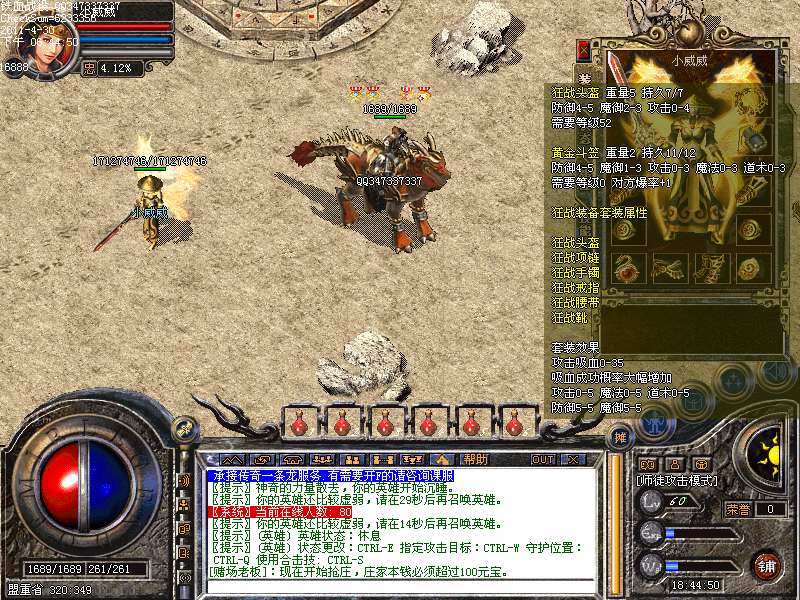 套装属性:战神套.全套8件:HP+20%。MP+20%.合击威力增家10%..狂战套.全套8件:全属性+5.吸血35%.防暴+10%
