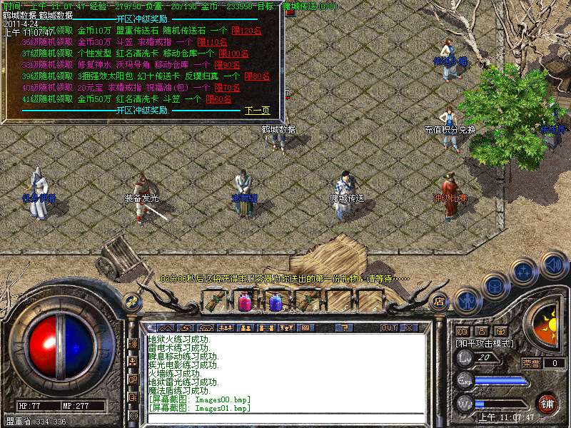 <255,137>特别提示:特色地图【通天神塔】由传送小姐特色地图进入。该地图仅需要金币即可进入,共10层每1层都有BOSS守护,顶层为圣龙。塔内宝藏无限,怪物经验多多。是个练级打宝的绝佳圣地!