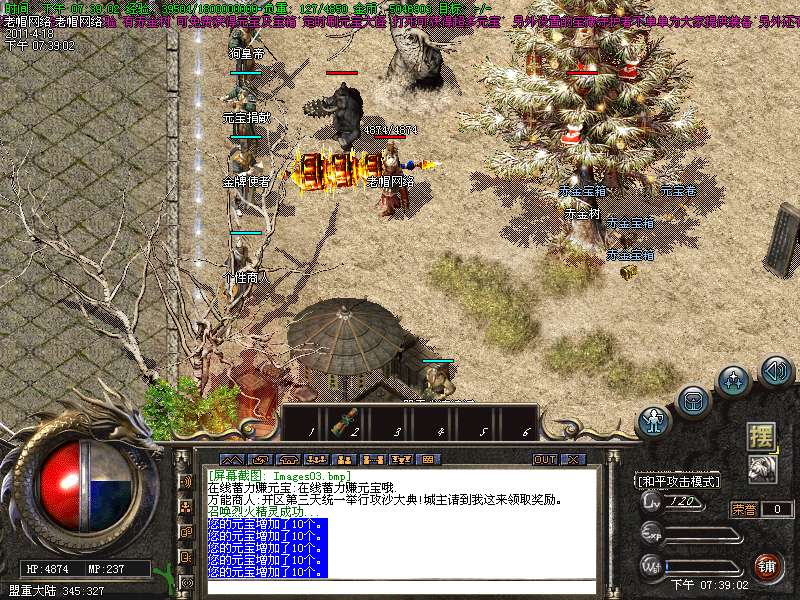 盟重土城设有经验猪`可免费获得经验`有赤金树`可免费获得元宝及宝箱`定时刷元宝大怪`打死可获得超多元宝`