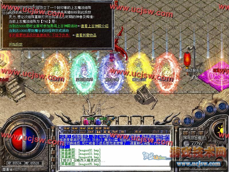 [上古结阵]:玩家在游戏打宝中.可将装备进行回收.每达回收一定程度.系统将自动怪物攻城!