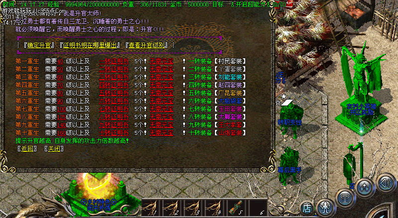 【转生系统】人物转生需要到盟重土城左边的转生雕像那里完成转生.转生后可获得属性奖励.还有酷炫的转生封号.