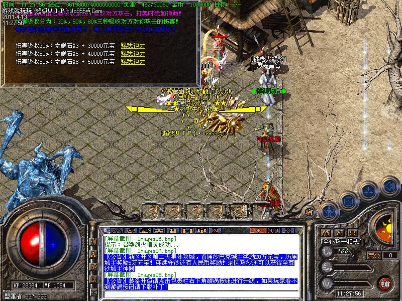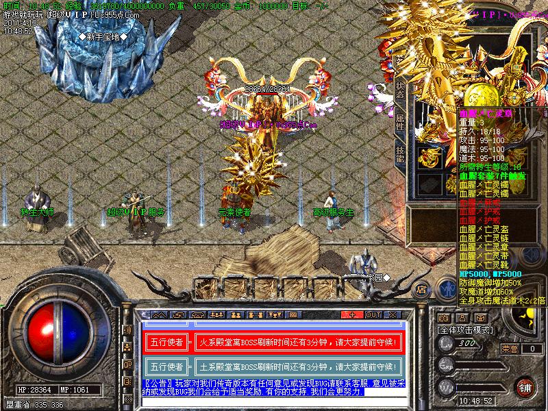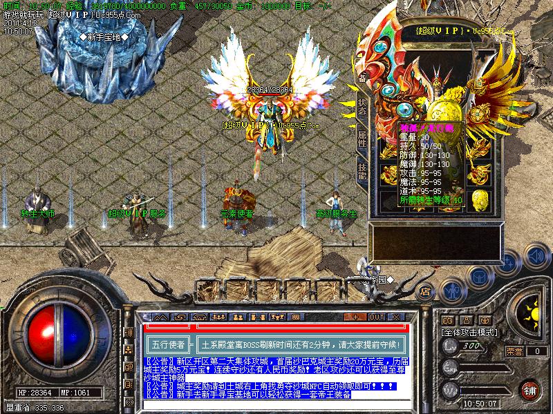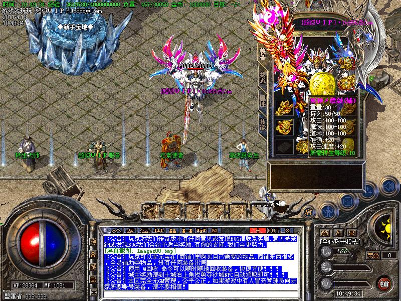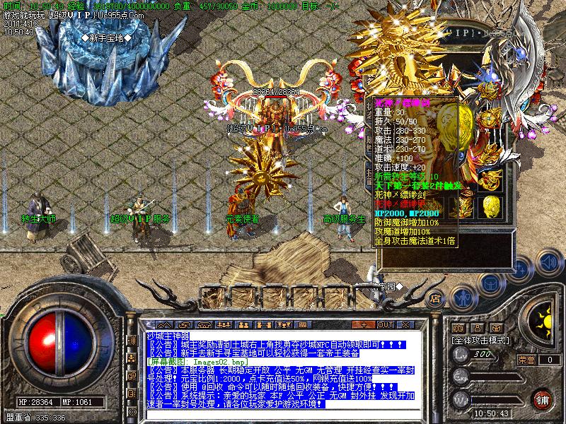 新区开区第二天集体攻城,首届沙巴克城主奖励20万元宝,历届城主奖励5万元宝!连续守沙还有人民币奖励!老区攻沙还可以获得至尊沙城主神器本服唯一的网站:装备升级请点击包裹栏右下角漩涡按钮进行升级,如果玩家看不到漩涡按钮请下载补丁!