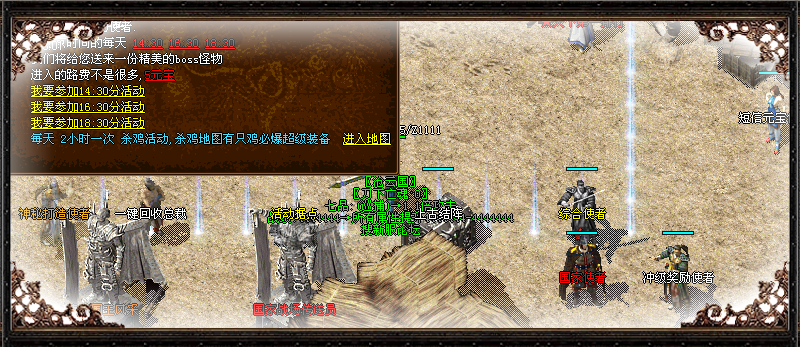 【公告】各个安全区自动喊话的NPC都是假的,系统喊话是红字和蓝字,所以请玩家特别注意不要上当.本服唯一客服无GM 会员命令为:@会员本服是长久服,且在线的玩家,全都是活人,服务器不做那些弄假人增加人气,导致安全区特卡的事,本服也不是快餐服,请那些想两个小时就称霸全服的玩家及家族尽快闪人![151]举报加速及外挂,请点击土城药点左边的NPC,并按照说明进行举报,我们会在第一时间处理,谢谢!!!对于开加速及外挂的玩家,经查实后,直接做封IP处理【公告】服务器提高了全服暴率,一些新地图的怪物暴血牙,而三万点血以上的十几种怪物,暴终极复仇,且暴率非常高,服务器,每天还不定期举行各类活动!!!