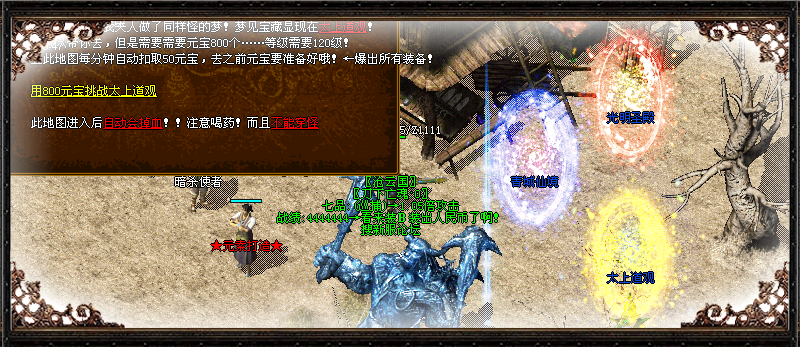 【申明】本服绝对无GM,无客服QQ,游戏里任何形式说自己是GM的全是骗子大家小心上当!!本服元宝比例1:2000 点卡多送%20 网银多送%50~~一律使用冲值平台冲值【更新】更新【青城仙境】【太上道观】等几个地图,挑战非常大,怪凶爆率高!爆出血牙!复仇等!!