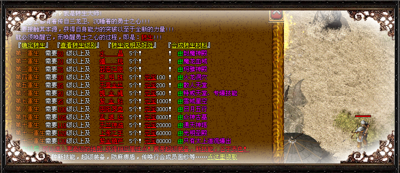 【更新】更新转生系统,1-12转,转生后每转都可以获得相应属性点,另外还设置转生奖励,4-12转可以分别领取各种技能书及超级装备,防麻痹盾牌,1。5倍力量面纱等!!具体土城转生炉处了解!
