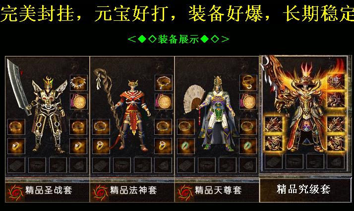 <255,220>提示:本服元宝超级好打,九套好混,别忘记每次激活九套,发挥最高攻击.一切装备靠打,特别增加腰带,靴子,宝石,打破76服无四格。四格装备迷失地图暴。