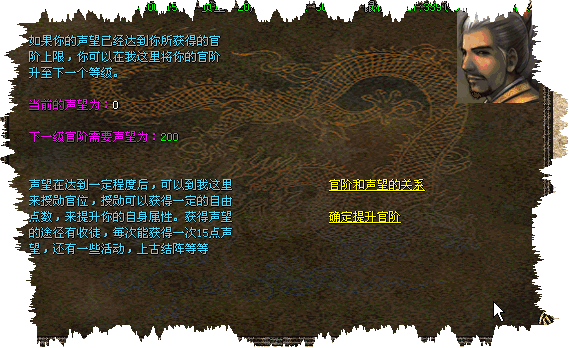[146] 兑换官阶封号可以找土城官阶大使,兑换官阶封号可以为自身增加属性点,随着封号的提高,所获得属性点也逐步增加。还增设了官阶地图,官阶越高进入的地图越深层.让封号不光是一个虚有的功能!