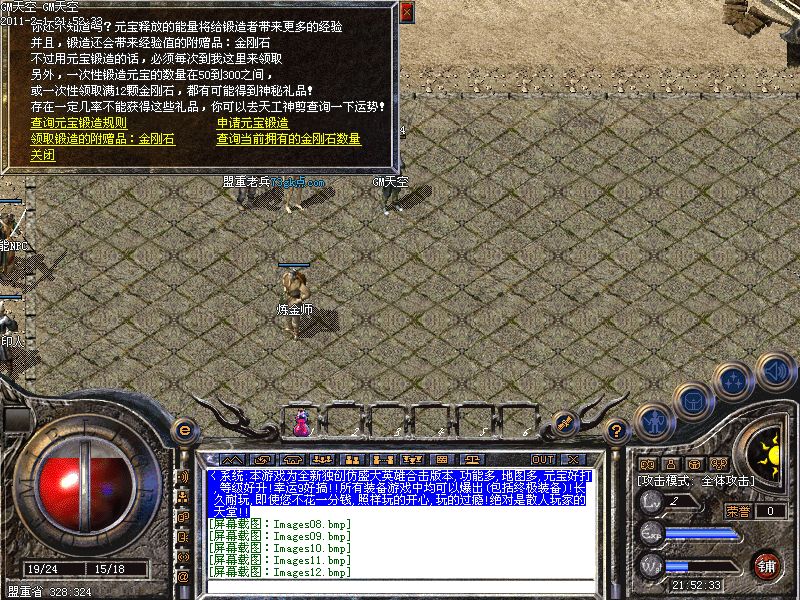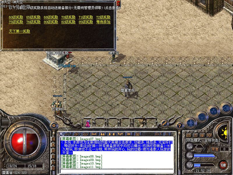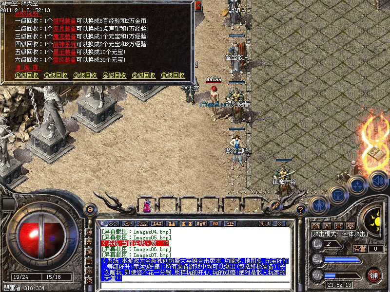 沙巴克功城战定于开区三天后,届时系统自动添加所有行会至攻城列表,自由攻城,沙城奖励为8000元宝!城主战袍1件!王者衣服1件!龙炎之刃武器1把,请准时参加!!!