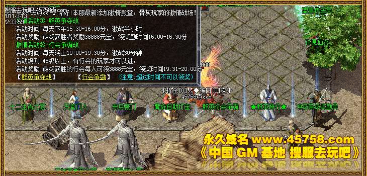 【公告】:⒙本服.每天下午15:30分—16:00分系统会弹出窗口提示[群英争霸战、激战30分钟]最后一个活在里面的玩家将可以获得奖励元宝38888个