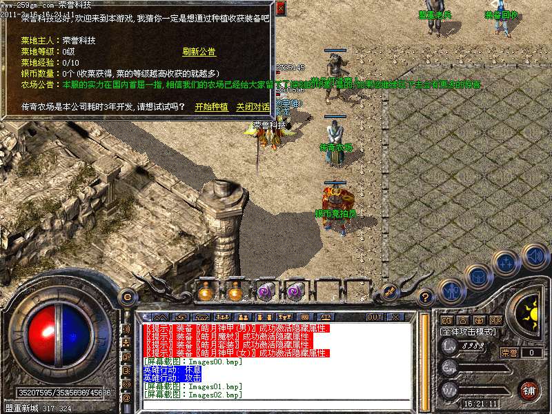 ◆新手闭关:每秒80万经验!免费泡到顶级! ◆中级闭关:每秒150万经验!经验飞飚!(免费) ◆元宝闭关:每秒1500万经验100元宝/秒! ◆装备活动:开区当天举行一场夺宝活动,爆终极装备! ◆元宝活动:每天下午3点,争夺天下第一活动!奖励海量元宝! ◆农场活动:农场种植有一定几率获得终极装备! ◆新区第3天晚上8点攻沙,奖励88万元宝!