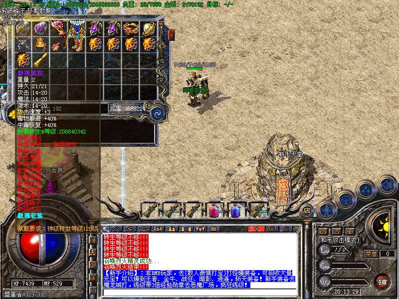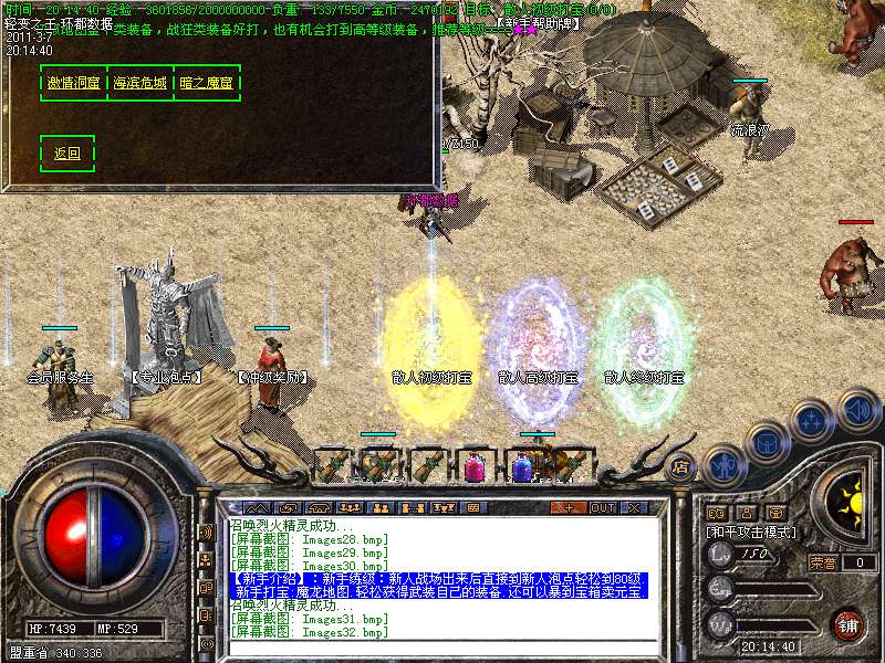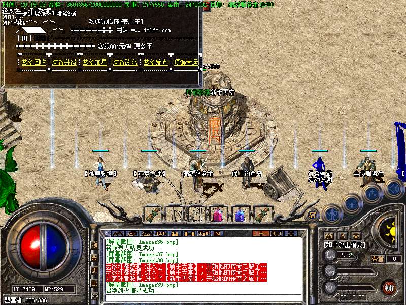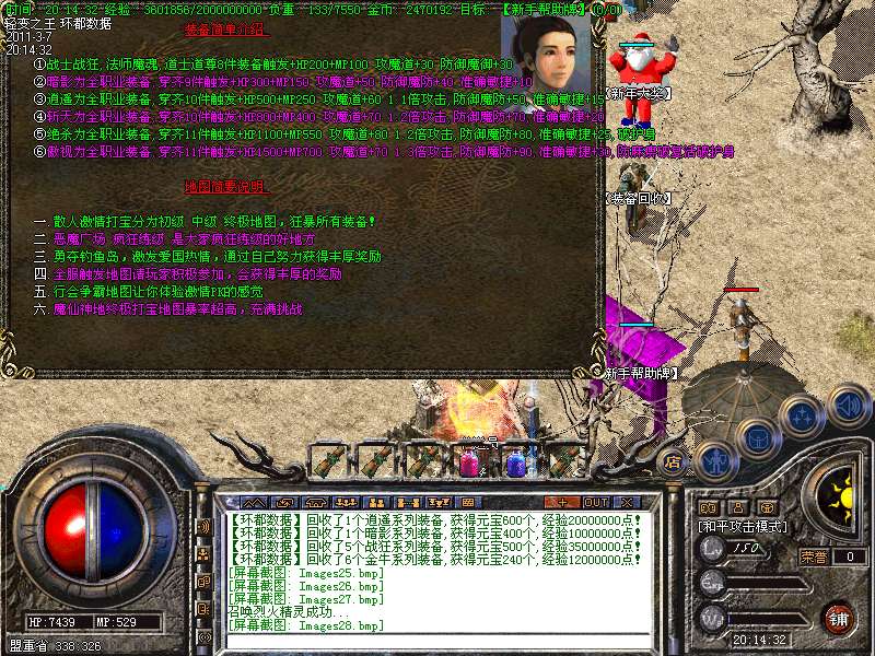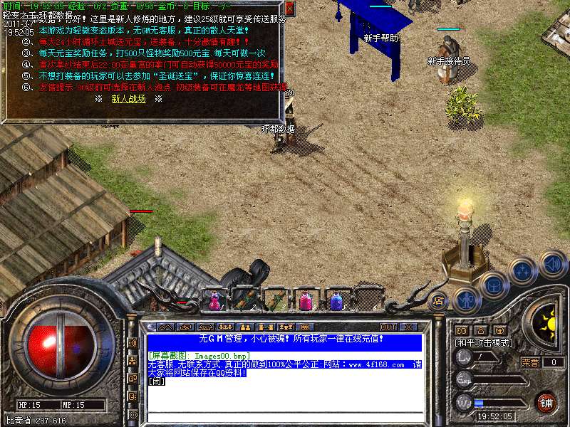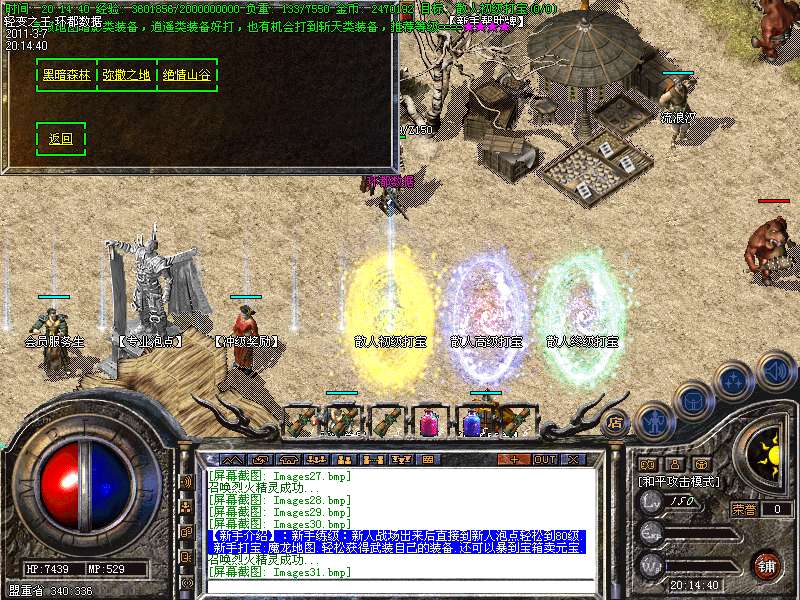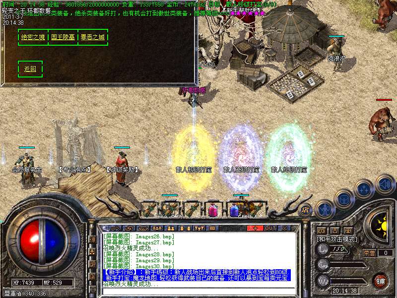 【新手介绍】:非RMB玩家,去[散人激 情打宝]打怪爆装备,可回收大量元宝!可以爆到王者、金牛、战狂、暗影、逍遥装备,斩天装备!新手装备去魔龙城打,练级带3倍经验勋恶魔广场,疯狂练级!
