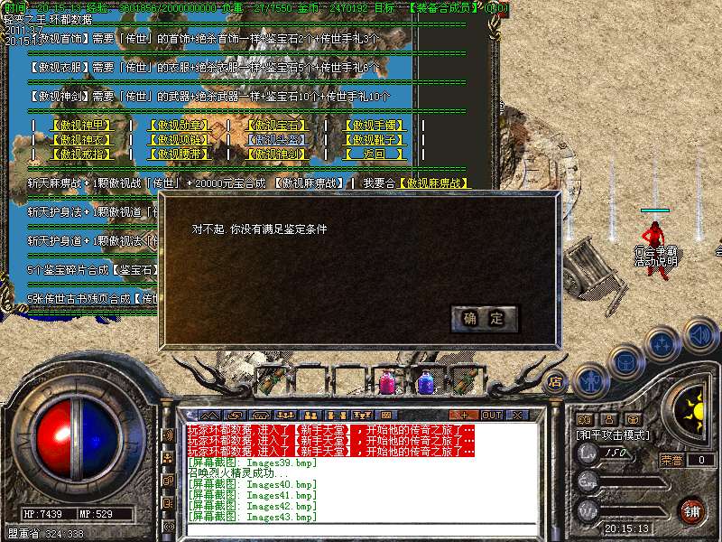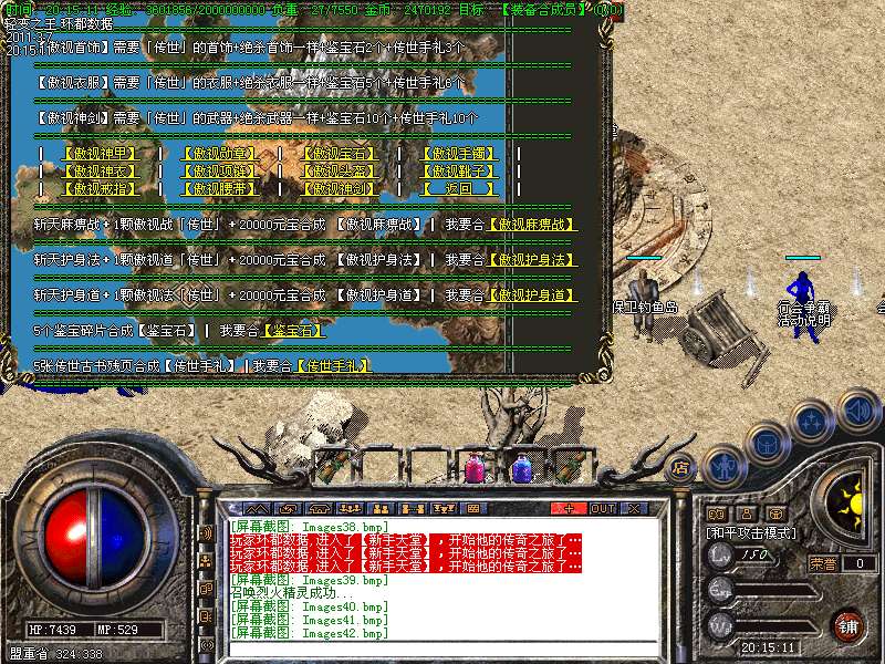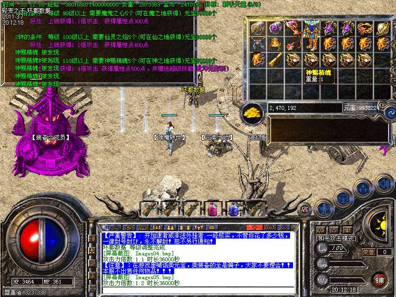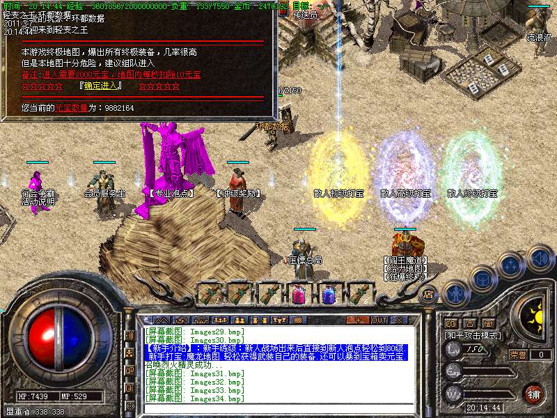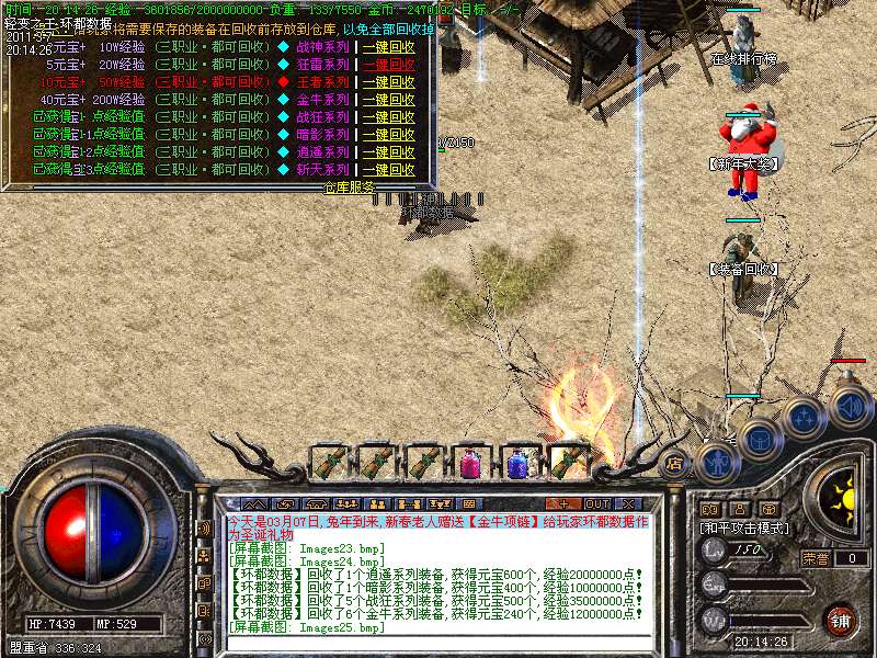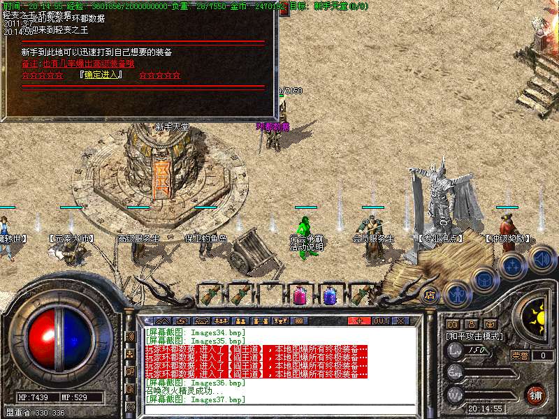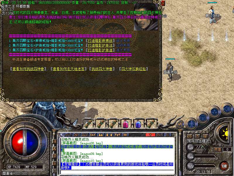 【新手介绍】:非RMB玩家,去[散人激 情打宝]打怪爆装备,可回收大量元宝!可以爆到王者、金牛、战狂、暗影、逍遥装备,斩天装备!新手装备去魔龙城打,练级带3倍经验勋恶魔广场,疯狂练级!