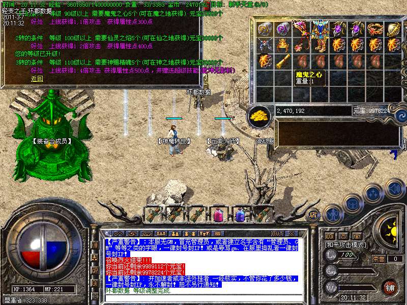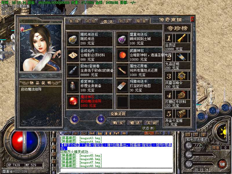 八.【特殊刷新】用魔法神石在土药旁边的魔法结阵可召唤出蚩尤.同时可获得丰富的奖品.--即本服的所有装备都可送出!