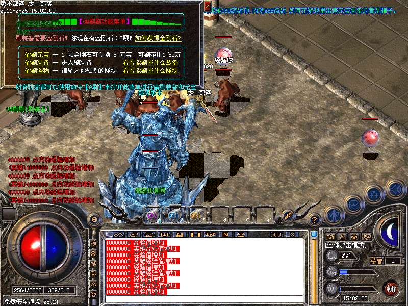 全服务器玩家都可以使用命令【@刷】打开偷刷装备、元宝、怪物菜单。需要金刚石可在各个地图的BOOS级怪物身上爆出。也可以去兑换!