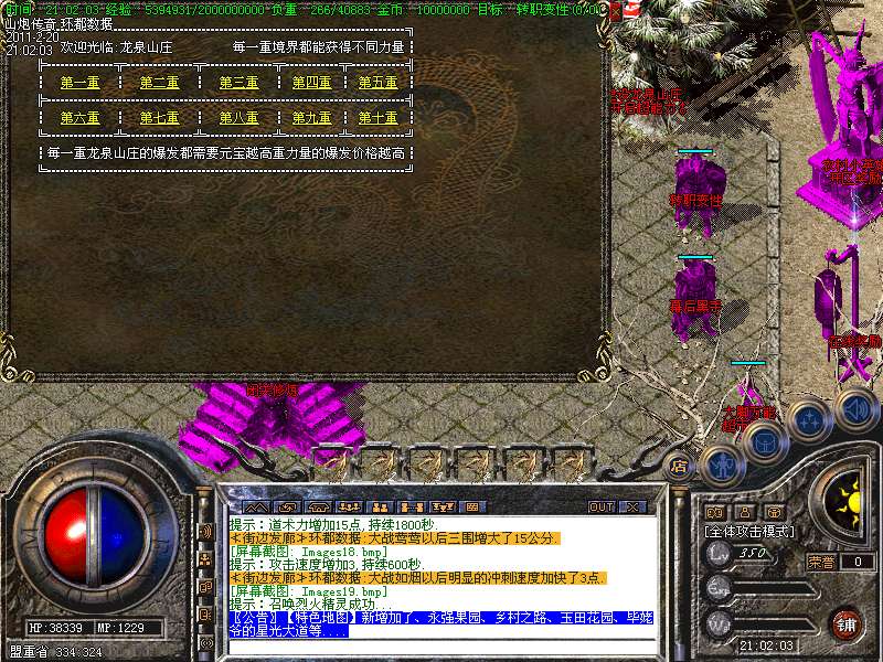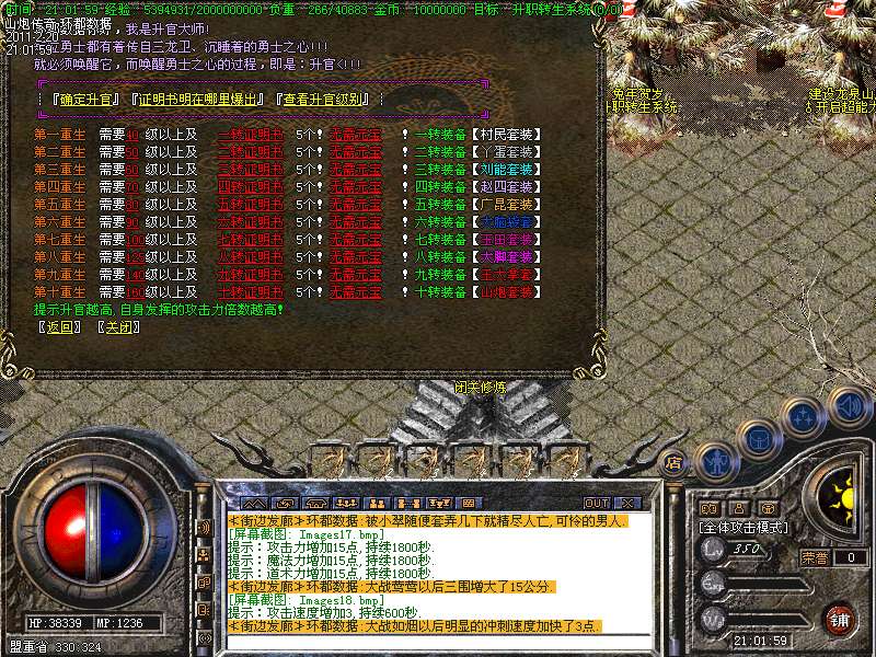 【转生系统】人物转生需要到盟重土城左边的转生雕像那里完成转生.转生后可获得属性奖励.还有酷炫的转生封号.