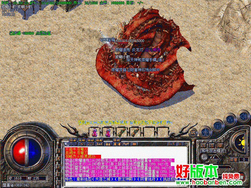 特色:加入盛大最新装备(传奇套装)最新怪物(冰眼巨魔)最新地图(消失传奇之城)(衣服专暴殿)(武器专暴殿)