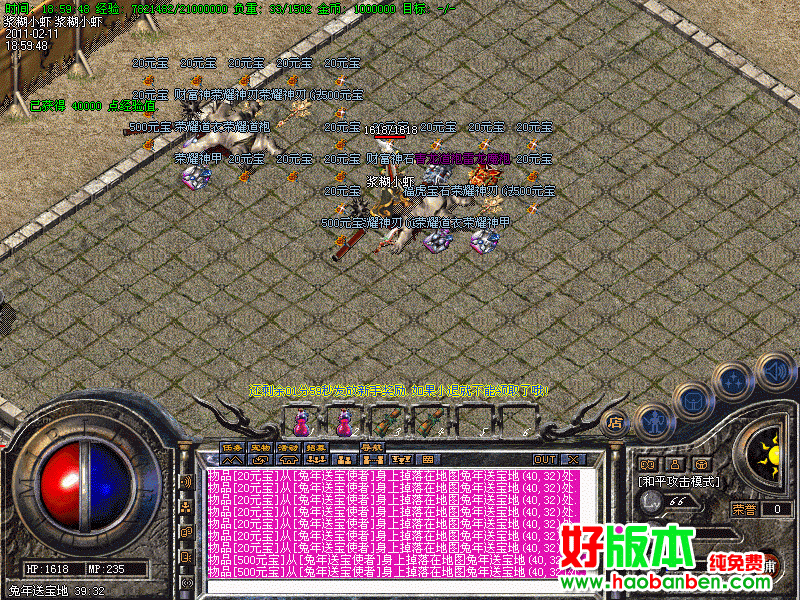 每天晚上18点-19点 荣誉大战,获胜行会可以自动领取20000元宝的奖励!三天后沙战,奖品:3000000元宝