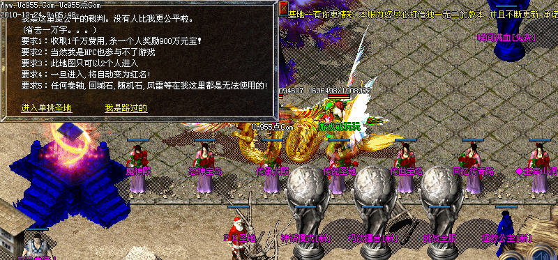 天下第一申请;每天零点自动清理,请玩家去NPC处申请,1.2倍攻击可别让别人抢走咯,还可以领奖哦,(1.2被攻击包括攻击/魔法/道术)(城主为1.3倍)