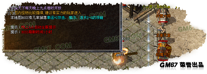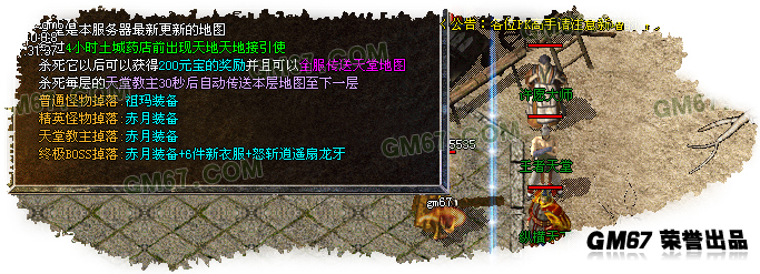 每隔4小时天堂开放一次,杀死每一层的天堂教主全地图的玩家自动传送至下一层.天堂BOSS相对厉害,主要掉落6大衣服以及怒斩等装备,有一定几率掉落新套装.<255,219>