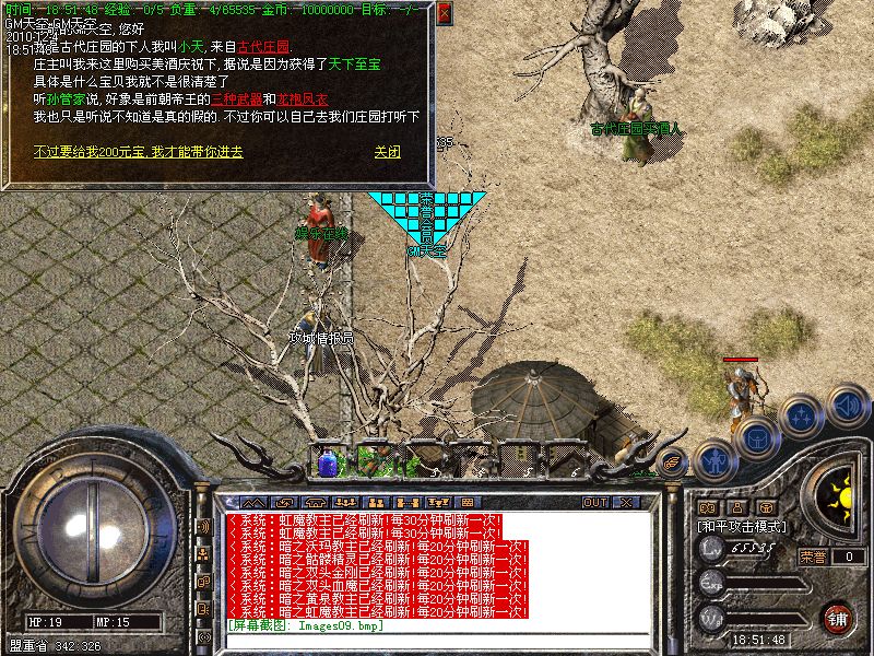 增加游戏乐趣!本服每2小时刷新一只[万年树妖]相当于最好的BOSS哦!还有机会获得马牌那!