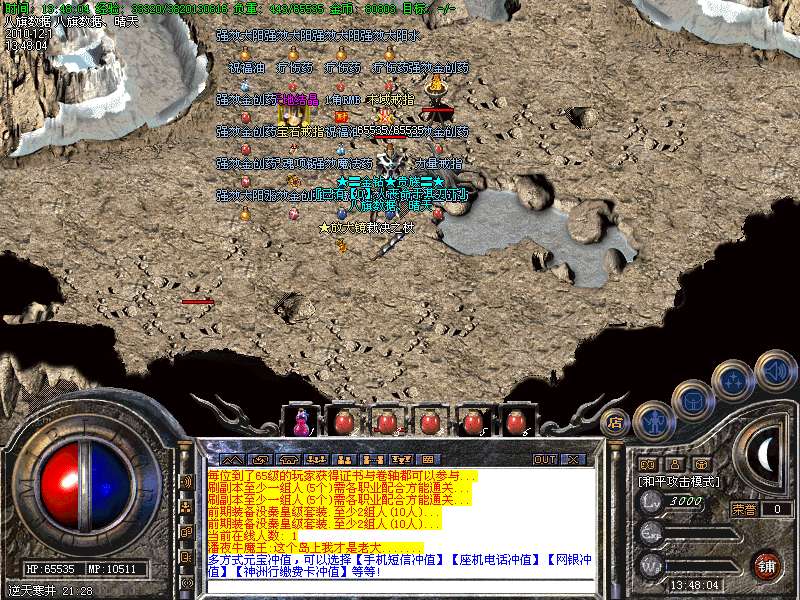 公告:本服新开65级副本和72级副本.24小时免费开放.里面全是精英怪物.就算你装备再好也得找几个朋友一起去.副本24小时全天开放.