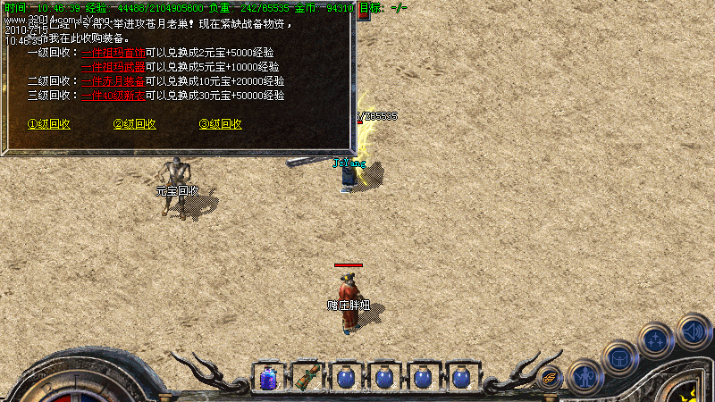 ⑾.装备回收:祖玛回收→次月回收→衣服武器回收→精品回收没用的装备在这里换元宝.打装备赚元宝两不误