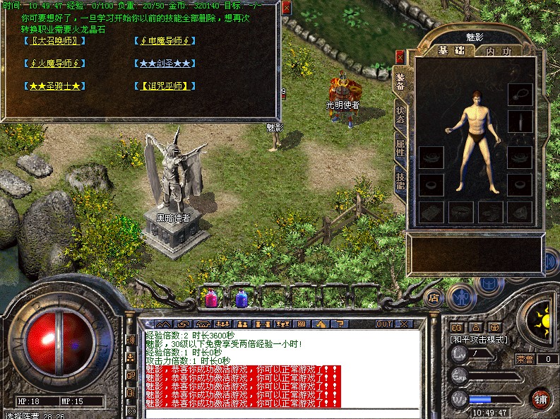 潜行术: 超级隐身技能,使用后一定时间内,怪物人物无法看到,且可以走动和PK