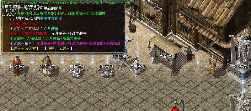 特别地图:王者天堂为打宝天堂,每天16点开放.此地图任何大小怪物都可以有机率暴出赤月类装备和精品首饰、终极武器!