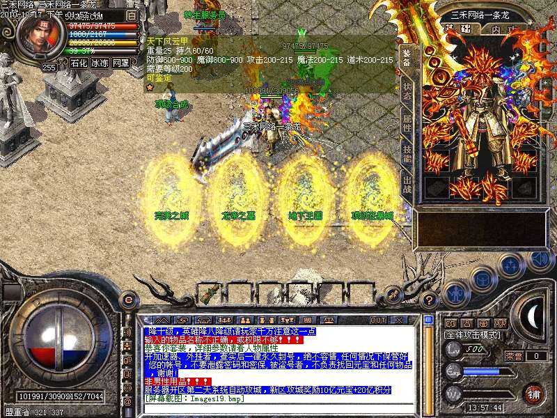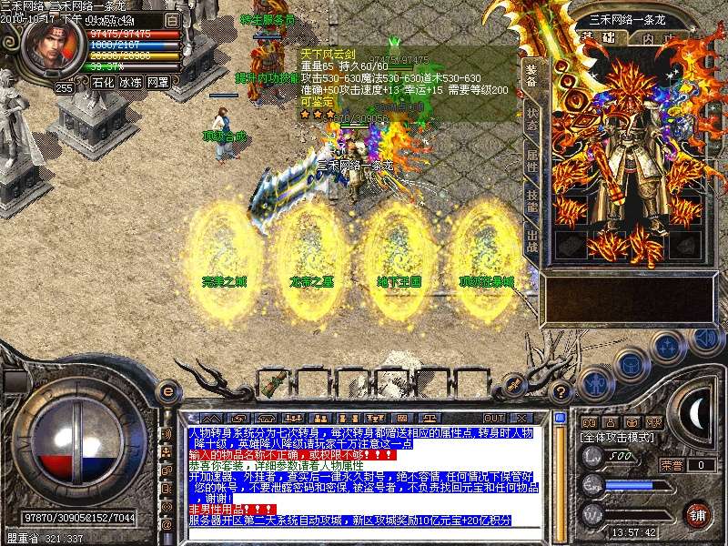 〖版本介绍五〗:增加风云天下套装,系补丁套装!装备全面提升属性!具有复活麻痹作用!武器衣服