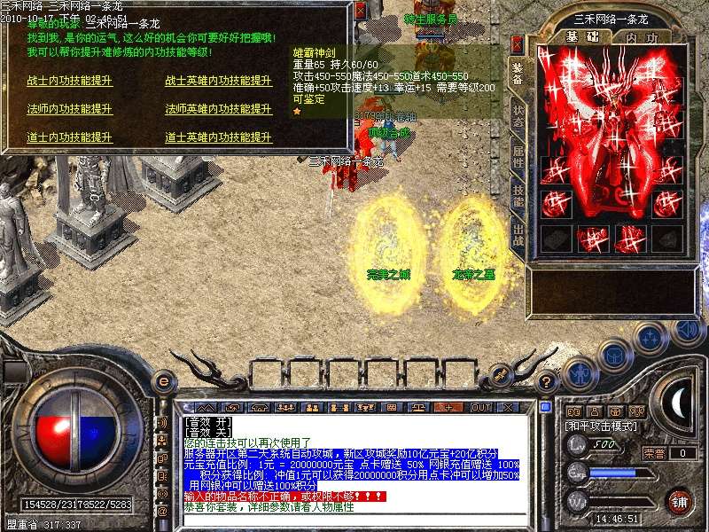 〖版本介绍一〗:人物等级300级封顶,内功等级255级封顶,内功技能等级提升,点击土城内功提升 NPC,不必自已修炼,180级以后只能在激情免费泡点地图修炼!