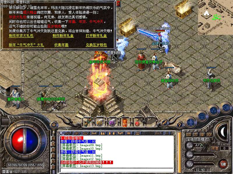 3、升级奖励:40级送赤月套,50级送强化魔龙套,65级以后每个级别都有装备送,详情请查看盟重城(322.324)处的公告牌.