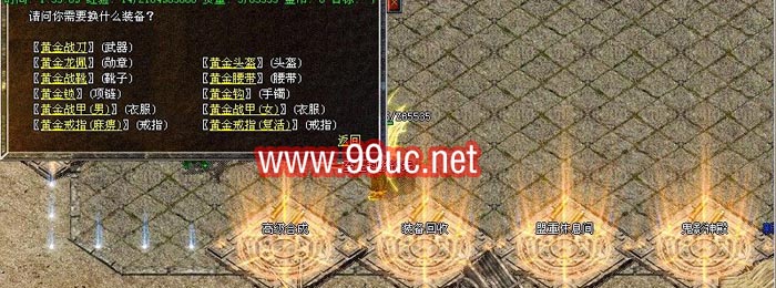 【合成篇】一级为3合1,其他都是2合1,比如3把怒斩合成怒斩①,2把怒斩①合成怒斩②…… 赤月装备、怒斩、龙牙、逍遥扇等等都能合成,麻痹、护身、复活戒指不能合成;勋章宝石不可合成,高级勋章宝石只有打BOSS方可获得;简化合成步骤,点击一下就能把包裹内能合成的装备通通合成,不用选择装备种类、级别,更快更方便; ⑤号以上装备外观每合成一次都有变化,需要下载补丁才能看见。