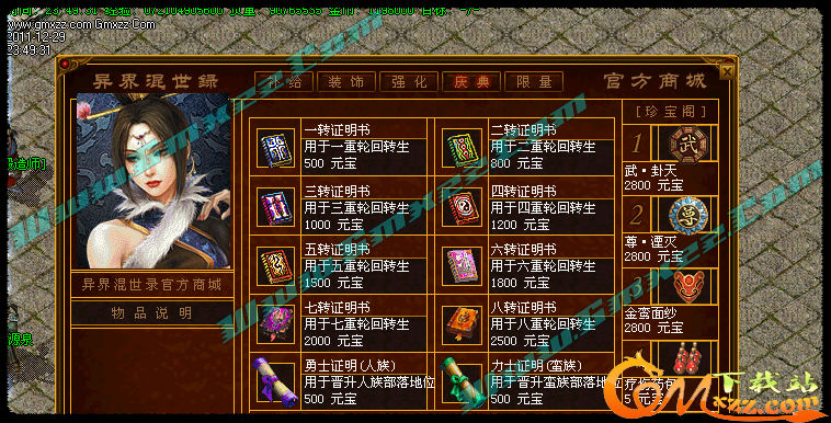 轮回转生:目前转生分十转,转生将奖励四级技能,自创技能!详细请看土转生仙子NPC