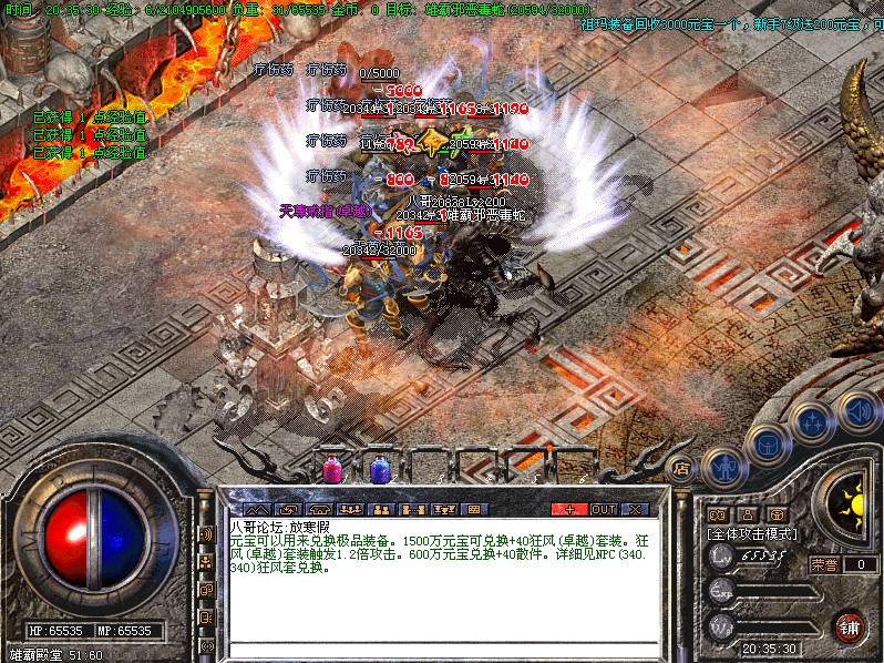 元宝可以用来兑换极品装备。1500万元宝可兑换+40狂风(卓越)套装。狂风(卓越)套装触发1.2倍攻击。600万元宝兑换+40散件详细见NPC(340.340)狂风套兑换。