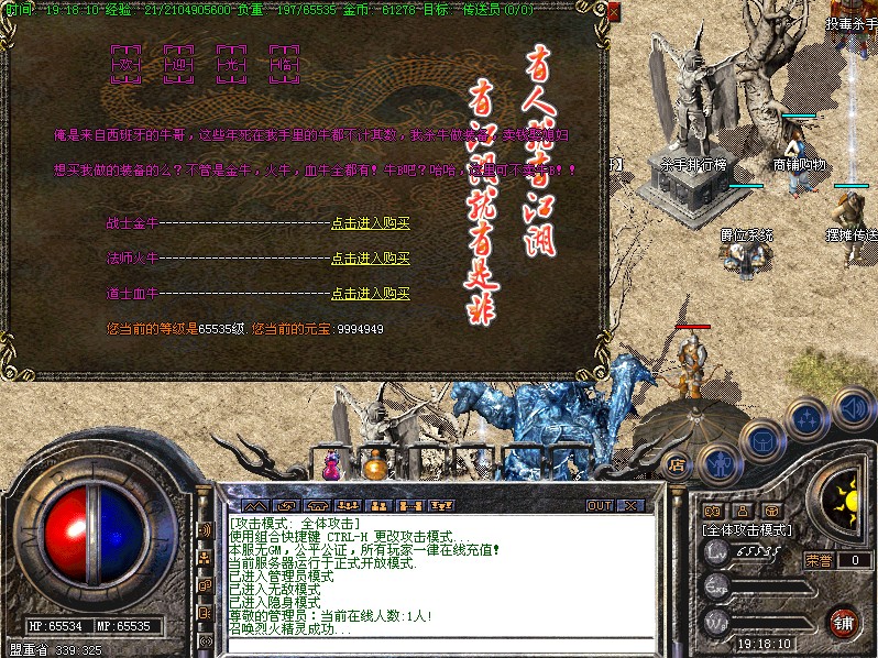 为了方便部分玩家,本服特设中级装备-金牛,血牛,火牛--直销点,可在“斗牛大哥”处购得!