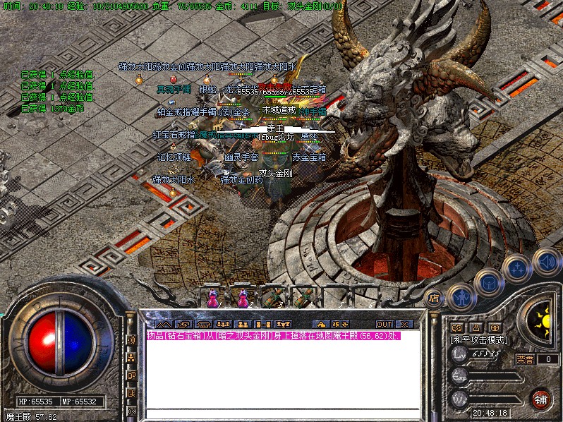 恶魔世界此地图大小BOSS刷新均比较快,适当结伴边抽烟边打宝,升级超几吧快。烟花教主每60分钟刷新