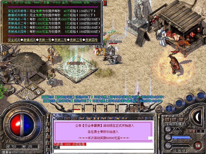 关于攻沙奖励的公告:新区第一任沙巴克城主奖励:150万元宝;老区(合区后)攻沙的奖励为:50万元宝;