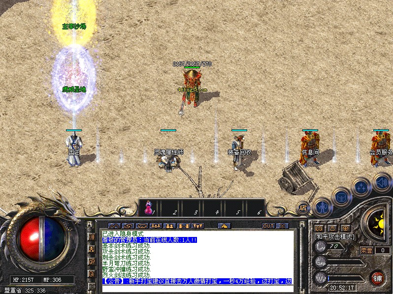 特色:行会掌门可使用命令:@行会令 召集本行会所有成员到自己身边一起战斗,召唤一次500元宝。