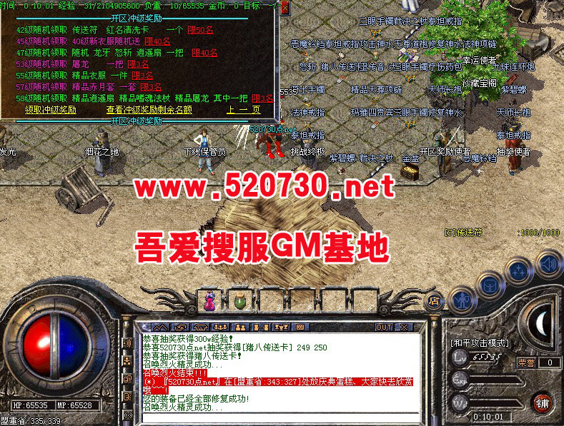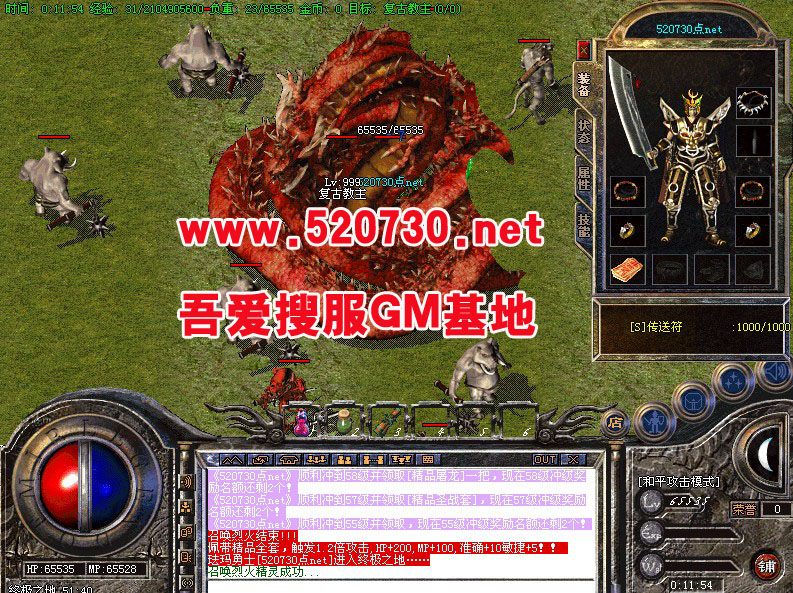 〖提示〗:本服务器高级怪物30分钟刷新,沙宝阁怪物60分钟刷新,新衣服暴率为1/20,赤月首饰暴率为1/10,苍月武器1/50。武器最高可升级7点,5分钟可取。赤月恶魔出屠龙,祖玛教主出嗜魂,地藏王出霸者之刃!