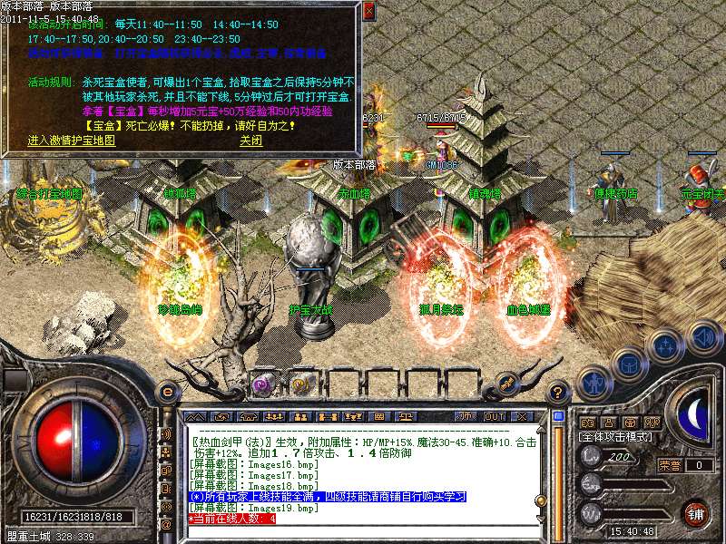 【活动】每天5次护宝大战!抢到宝盒的每秒增加5元宝50万经验!打开宝盒可获得超级装备!请看土城护宝大战NPC