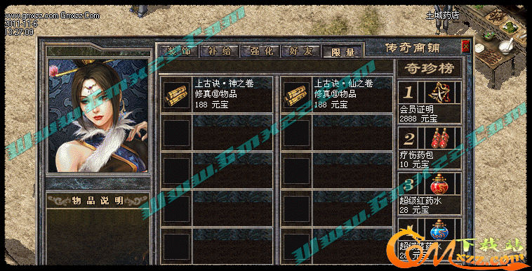 本站会员2888元宝,会员可以直接传送地图的最后一层,副本地图只需要10元宝就可以传送,还可以领取元宝工资和功勋值,更可以领取会员超级装备一件!