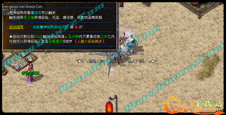 魔神结阵启动可以获得元宝、经验、建设度等奖励。启动次数达到100次就可以启动经验狂暴,站在NPC周围三步之内可以获得经验增加!